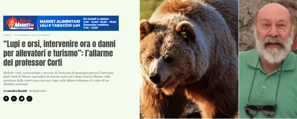 MICHELE CORTI ( portavoce allevatori/macellatori/cacciatori Ruralpini): LUPI ED ORSI DEVONO ESSERE UCCISI “Le specie selvatiche si comportano in funzione dell’uomo: se questo non consente alla popolazione di entrare nelle stalle, ABBATTENDO GLI ESEMPLARI, si genera timore per l’uomo e gli animali iniziano a stare al largo.