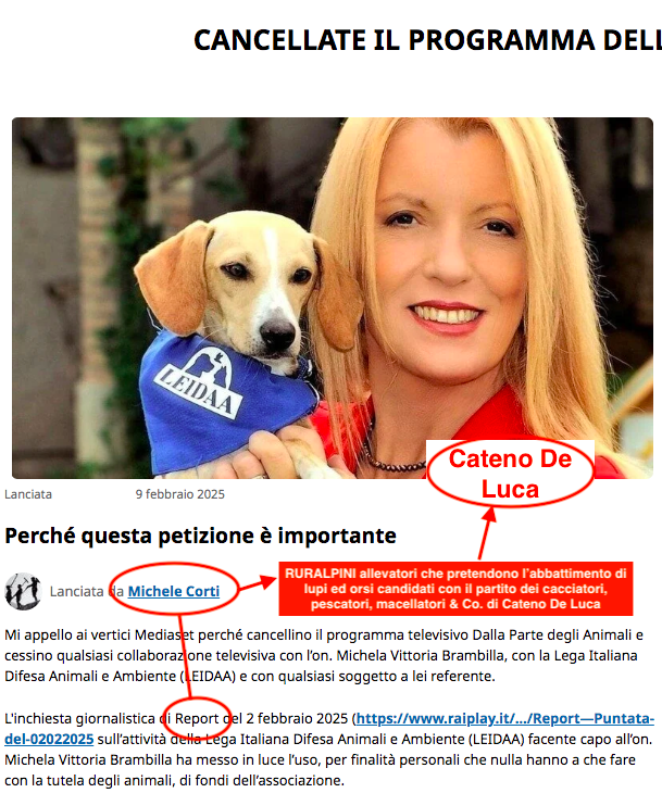 Non certo chi ama gli animali ma Report (per mera questione politica, l’inchiesta giornalistica afferisce solo ad una parte escludendo l’altra, pur sapendo https://partitoanimalistaeuropeo.wordpress.com/2025/02/03/report-faziosi-attacchi-politici-allon-brambilla/) unitamente ai cacciatori allevatori macellatori di Ruralpini (sostenitori dell’abbattimento di lupi ed orsi) che chiedono, addirittura la chiusura del programma televisivo della Brambilla “Dalla Parte degli Animali”