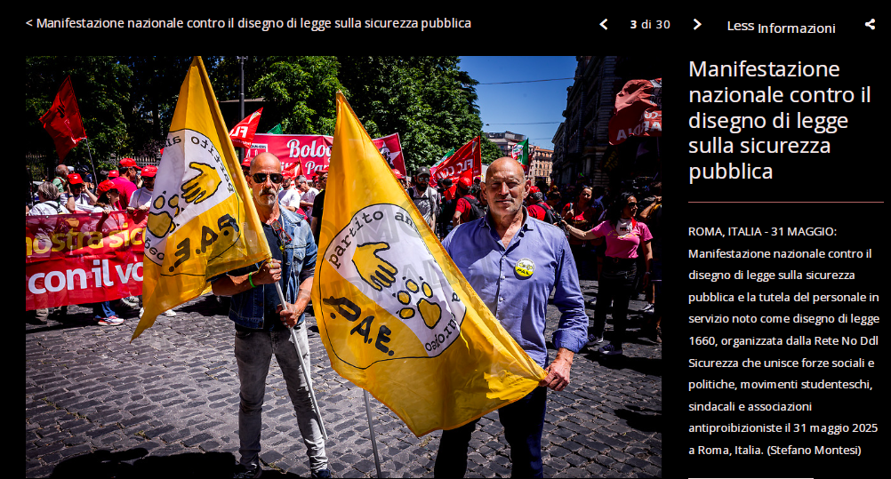 Roma, 31.05.2025. Il Partito Animalista Europeo è nuovamente sceso in piazza per dire no al DECRETO SICUREZZA unendosi alla lotta contro il tentativo del Governo Meloni di annichilire il diritto di manifestare il dissenso in ogni sua forma. E’ una pericolosa deriva autoritaria volta ad ottenere uno Stato di polizia, delegittimando il potere giudiziario. Così iniziò il regime il secolo scorso. Sono state introdotte nuove tipologie di reati, aggravanti ed inasprimenti delle pene tra cui la limitazione di manifestare con il pretesto del blocco stradale, diventato reato penale, contestualmente sono state aumentate di un terzo le pene, fino a 7 anni di reclusione, per minacce o resistenza nei confronti di un ufficiale o agente di polizia giudiziaria o di pubblica sicurezza, le lesioni anche «semplici» (abbiamo le prove che molte volte sono inventate: Presa in carico, valutazione clinica, anamnesi, visita, diagnosi, prescrizione della terapia, compilazione del referto e dimissione: tutto concentrato nello spazio di un solo minuto. Sessanta secondi per fare ciò che, nella realtà sanitaria, richiede tempi ben diversi. – così come riportato negli atti processuali) sono punite fino a 5 anni di reclusione e le circostanze attenuanti non possono essere ritenute prevalenti. Sono previste spese legali a carico dello Stato, con un tetto fino a 30 mila euro, 10 mila per ogni fase del processo, per gli agenti indagati per fatti inerenti al servizio. Gli stessi agenti potranno portare senza licenza alcune tipologie di armi quando non sono in servizio.